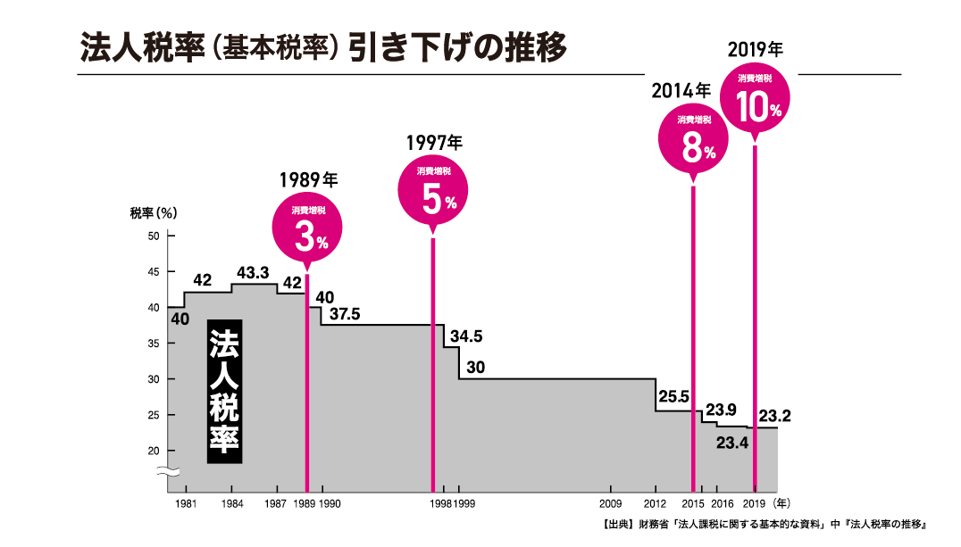 消費税が3%、5%、8%、10%と上がるたび、必ず法人税が下がる仕組み。